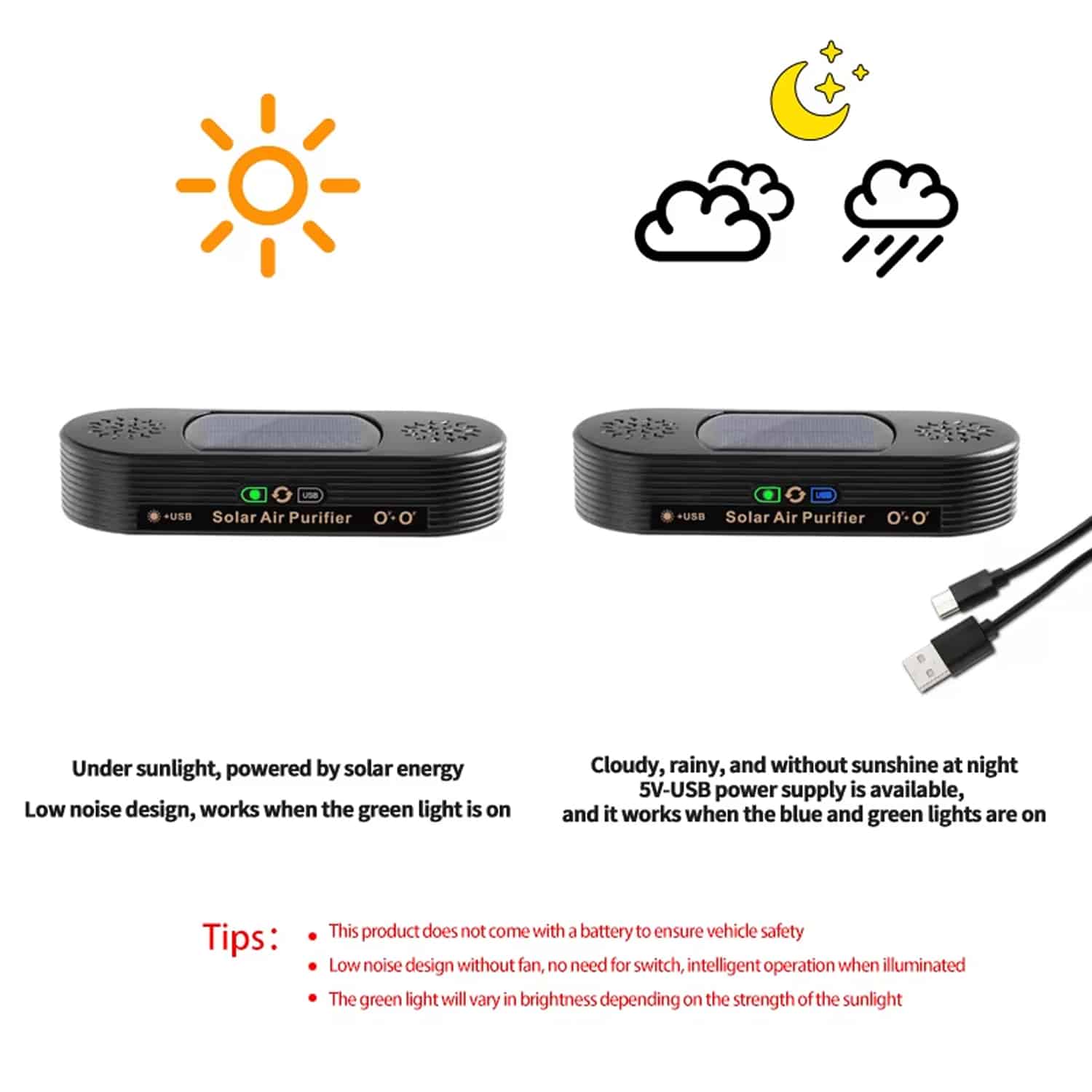 CaryClear offers dual power modes—solar and USB—ensuring your car air is always fresh. No more worrying about battery life or power sources; it adapts to your needs seamlessly.