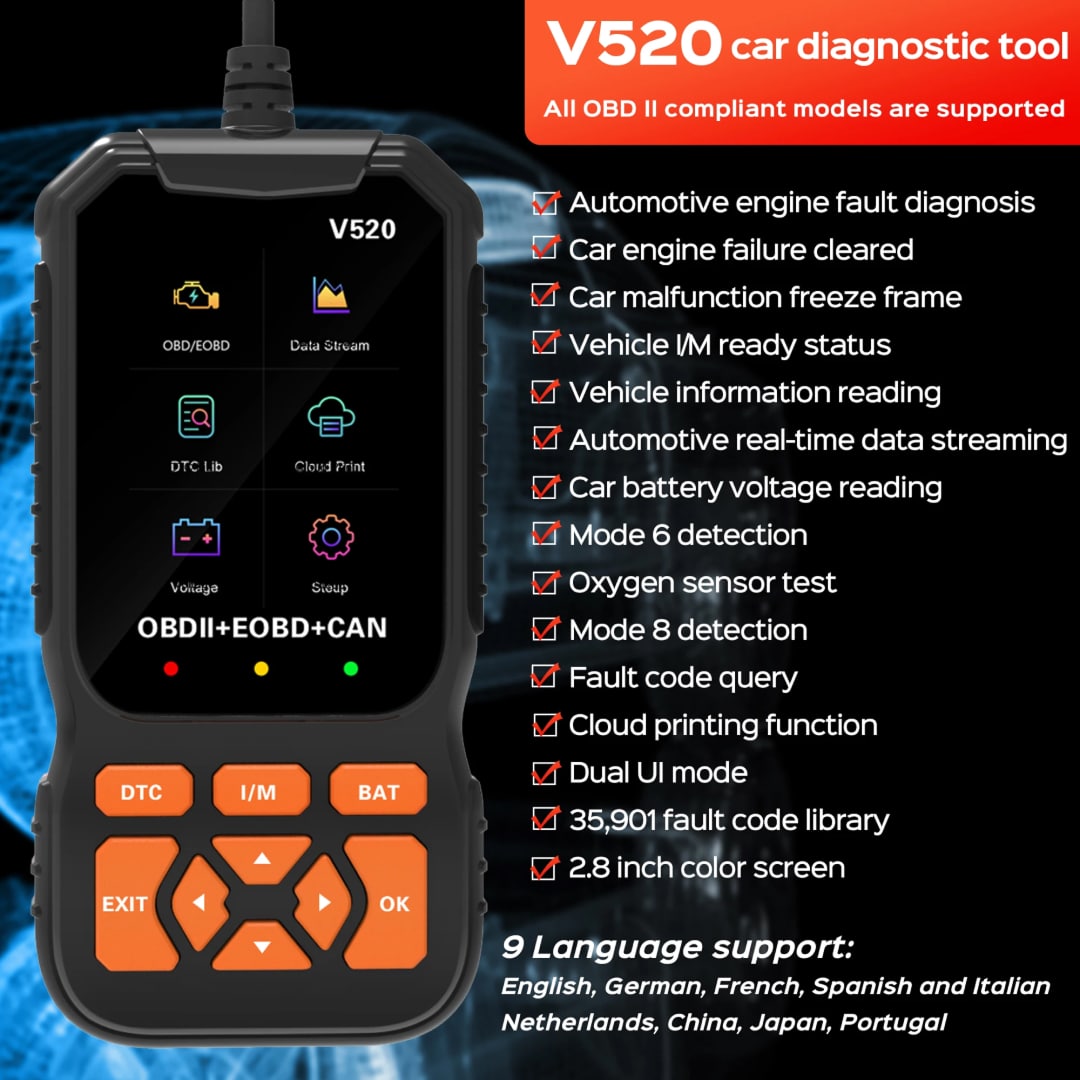 The scanner features an intuitive interface with clear instructions and multilingual support. Simply plug it in, turn your ignition, and follow the on-screen prompts for immediate diagnostic results.