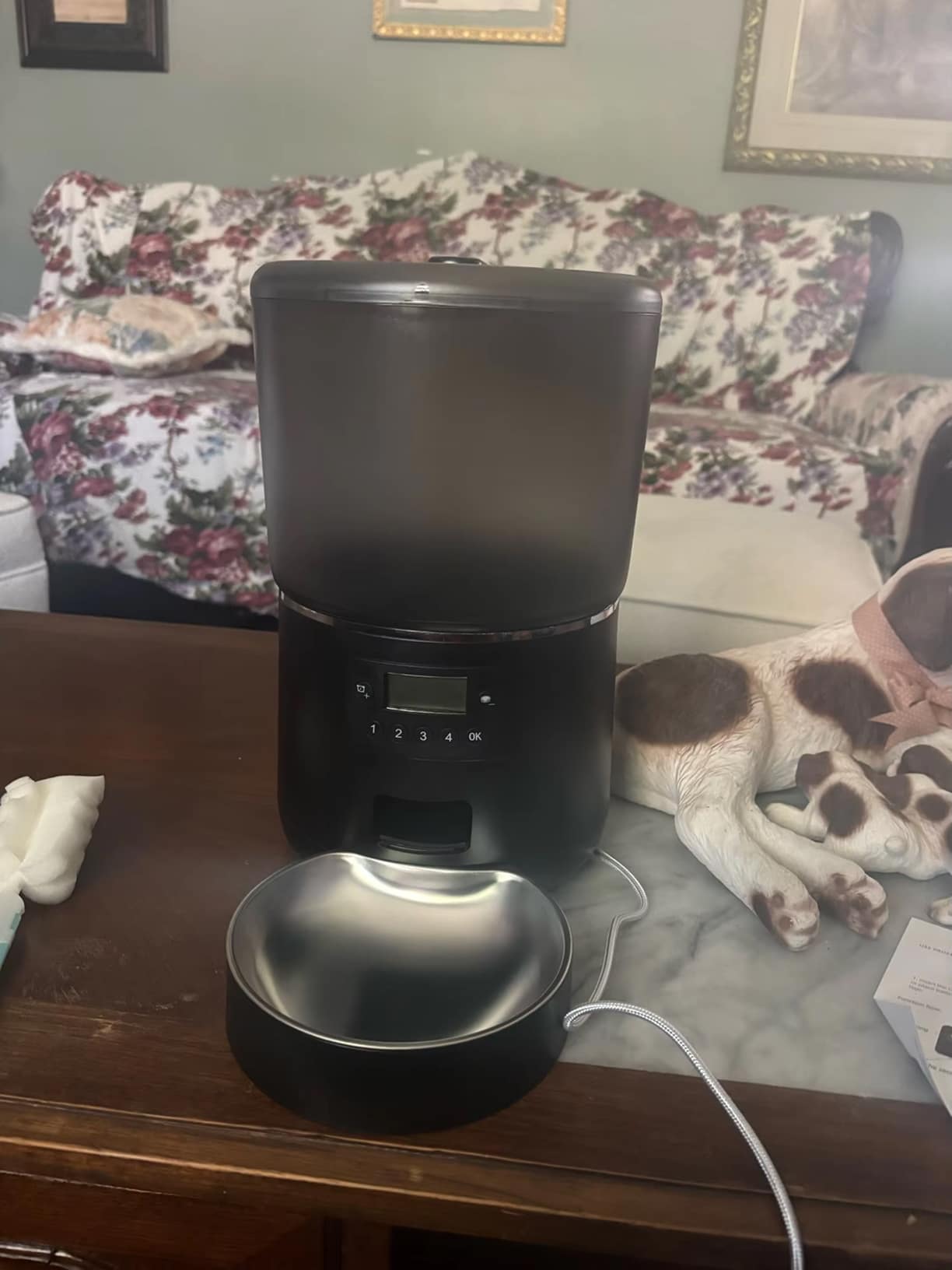 The EatyEasy feeder operates on a charge power source and has internal memory. It will retain all your programmed settings during a brief power outage and resume normal operation once power is restored.